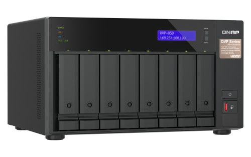 QNAP QVP-85B. Tipo: NAS. Tipo de chasis: Torre. Clase del dispositivo: Pequeñas y medianas empresas. Familia de procesador: Intel® Core™ i5. Memoria interna: 32 GB, Tipo de memoria interna: DDR4. Tipo de unidades de almacenamiento instaladas: Unidad de disco duro. Sistema operativo instalado: QVR Pro