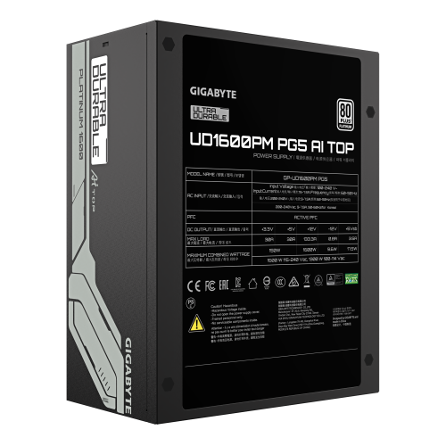 GIGABYTE UD1600PM PG5 AI TOP Fuente de Alimentación – PCIe 5.0, 80 PLUS Platinum, Diseño totalmente modular, Ventilador de 120 mm, Compatible con ATX 3.1, Enchufe EU