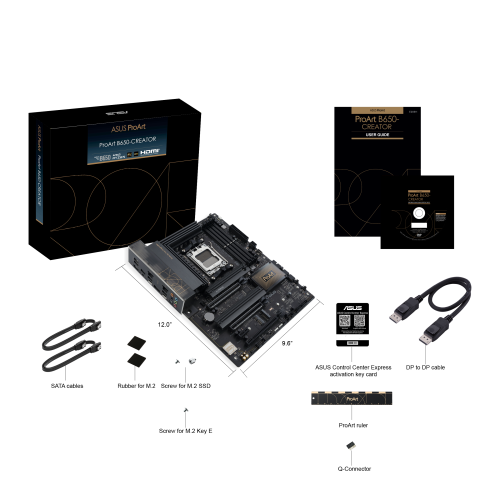 ASUS PROART B650-CREATOR. Fabricante de procesador: AMD, Socket de procesador: Zócalo AM5, Procesador compatible: AMD Ryzen™ 3, AMD Ryzen™ 7, AMD Ryzen 9 7th Gen. tipos de memoria compatibles: DDR5-SDRAM, Memoria interna máxima: 128 GB, Tipo de ranuras de memoria: DIMM. Interfaces de disco de almacenamiento soportados: M.2, SATA III, Tipos de unidades de almacenamiento admitidas: HDD & SSD, Niveles RAID: 0, 1, 10. Tipo de interfaz ethernet: 2.5 Gigabit Ethernet, Gigabit Ethernet. Componente para: PC, Factor de forma: ATX, Familia del chipset: AMD