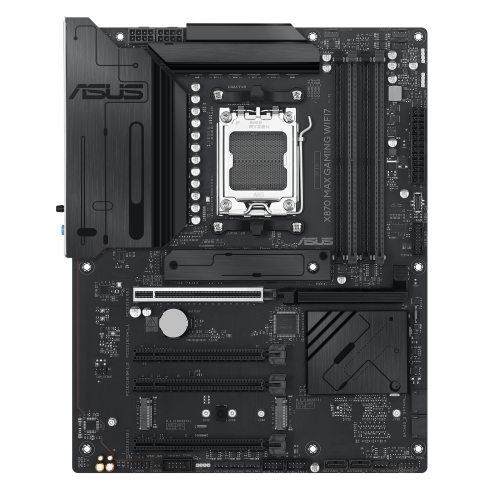 ASUS X870 MAX GAMING WIFI7. Fabricante de procesador: AMD, Socket de procesador: Zócalo AM5, Procesador compatible: AMD Ryzen 7000 Series, AMD Ryzen 8000 Series, AMD Ryzen 9000 Series. tipos de memoria compatibles: DDR5-SDRAM, Memoria interna máxima: 256 GB, Tipo de ranuras de memoria: DIMM. Interfaces de disco de almacenamiento soportados: M.2, SATA III, Tipos de unidades de almacenamiento admitidas: HDD & SSD, Niveles RAID: 0, 1, 5, 10. Conector USB: USB tipo A, USB Tipo C. Tipo de interfaz ethernet: 2.5 Gigabit Ethernet, Estándar Wi-Fi: Wi-Fi 7 (802.11be)
