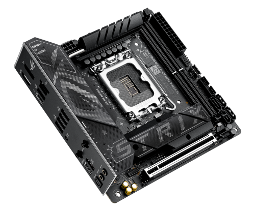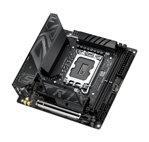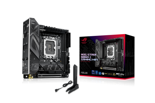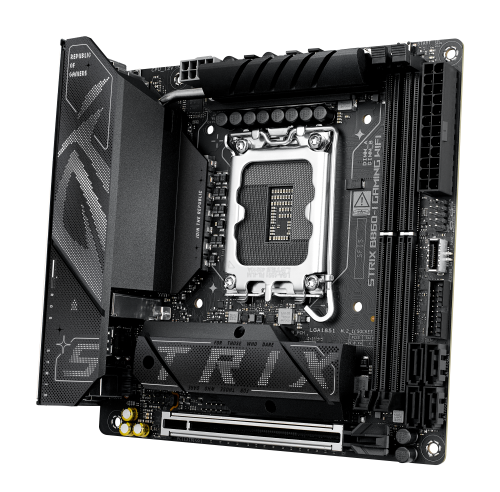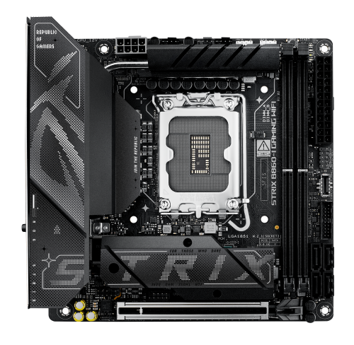 ASUS ROG STRIX B860-I GAMING WIFI. Fabricante de procesador: Intel, Socket de procesador: LGA 1851 (Socket V1), Procesador compatible: Intel Core Ultra (Series 2). tipos de memoria compatibles: DDR5-SDRAM, Memoria interna máxima: 128 GB, Tipo de ranuras de memoria: DIMM. Interfaces de disco de almacenamiento soportados: M.2, SATA III, Tipos de unidades de almacenamiento admitidas: HDD & SSD, Niveles RAID: 0, 1, 5, 10. Tipo de interfaz ethernet: 2.5 Gigabit Ethernet, Estándar Wi-Fi: Wi-Fi 7 (802.11be). Componente para: PC, Factor de forma: mini ITX, Familia del chipset: Intel