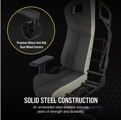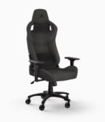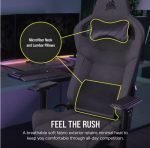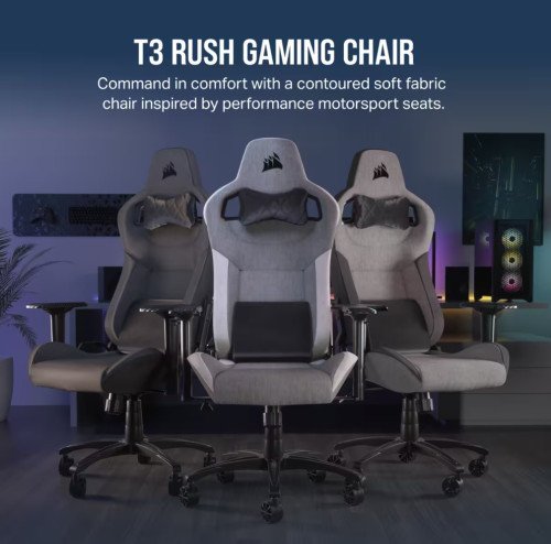 La silla para juegos CORSAIR T3 RUSH combina un diseño inspirado en las carreras y una comodidad contorneada con un exterior de tela suave y transpirable. almohada cervical acolchada exterior y soporte lumbar de espuma viscoelástica.