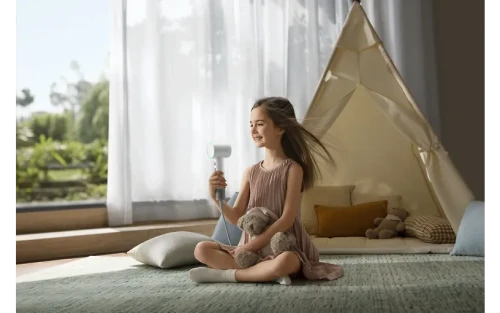 Secado rápido. Haga que el secado de su cabello sea rápido y sin esfuerzo con un potente flujo de aire. Un motor de 110,000 rpm genera una velocidad del aire de 70m/s* y un volumen de aire de 55m³/h* para un secado poderoso que separa el cabello húmedo para llegar a las raíces y elimina rápidamente la humedad del cuero cabelludo, secando el cabello que llega hasta los hombros en tan solo 2 minutos. Seque fácilmente su cabello de la manera que desee con 4 configuraciones de temperatura y 2 velocidades de flujo de aire. El modo de aire frío, el modo de temperatura constante de 57 °C con un termistor NTC avanzado para garantizar una temperatura constante, el modo de aire caliente y el modo de ciclo frío/calor lo ayudan a obtener el rendimiento de secado y el peinado que desea.300 millones de aniones/cm³.Ligero e intuitivo. Secado menos disruptivo.