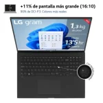 LG gram es un portátil ultraligero y con la máxima autonomía*, ideal para llevártelo de viaje, teletrabajar o estudiar desde cualquier lugar y en cualquier momento, aprovechando al máximo su alta portabilidad y autonomía y con un peso desde 998g .LG gram cuenta con un diseño ultra compacto gracias a sus marcos más finos. Además, en su mejora del diseño, incorpora una bisagra invisible que lo convierte en un portátil más elegante y funcional. Cuenta con un nuevo Touch Pad más amplio y preciso, y un teclado con retroiluminación donde se ha mejorado el tamaño y el recorrido de las teclas convirtiéndolo en un portátil más cómodo para trabajar. Su chasis de magnesio y nano carbono ha pasado 7 pruebas de resistencia, recibiendo el estándar militar de durabilidad STDMIL- 810H, que le convierte en uno de los portátiles ultraligeros más resistentes del mercado. Cuenta con una pantalla profesional con la máxima calidad de imagen y un rendimiento y conectividad espectacular.