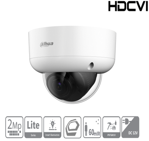 Cámara domo HD-CVI con sensor CMOS de 2 Mpx, sensibilidad de 0,01 lux, vídeo 1080p sin comprimir a 25/30 fps.Objetivo varifocal f = 2,7-12 mm (98,2-28,3° horizontal), iluminación IR hasta 60 m, filtro automático ICR, DWDR, tecnología Super Adapt, eliminación de ruido 3D NR. Salida CVI/TVI/AHD/CVBS seleccionable, impermeable IP67, antivandálica IK10, alimentación DC 12 V.