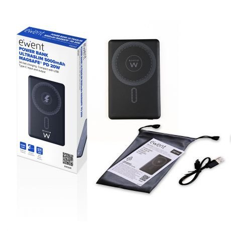 EWENT POWERBANK ULTRASLIM MAGSAFE 5000MAH PD 20W 1X USB-C (IN/OUT) 1X USB-A PORT 104X67X8 55MM 112GR BLACK