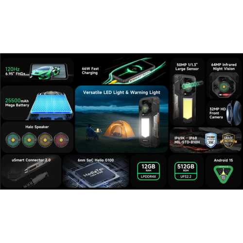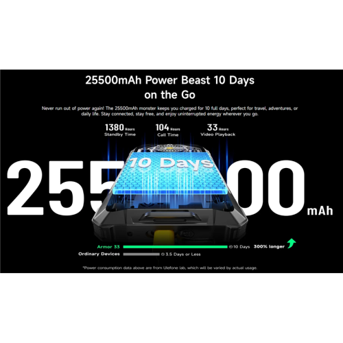 Ulefone Armor 33, 12 GB de RAM 512GB, pantalla de 6.95 pulgadas, 50MP+64MP+50mp, 25,500 mAh Batería, negro.