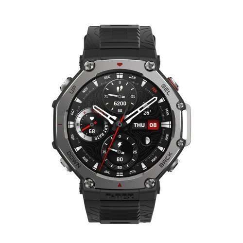 Amazfit T-Rex 3. Diagonal de la pantalla: 3,81 cm (1.5″), Tecnología de visualización: AMOLED, Resolución de la pantalla: 480 x 480 Pixeles, Pantalla táctil. Wifi. GPS (satélite). Capacidad de batería: 700 mAh. Peso: 68,3 g. Humedad: resistente al agua hasta: 100 m, Material de la banda: Silicona, Color de banda: Negro, Tamaño de banda: Talla única. Sistema operativo instalado: Zepp OS